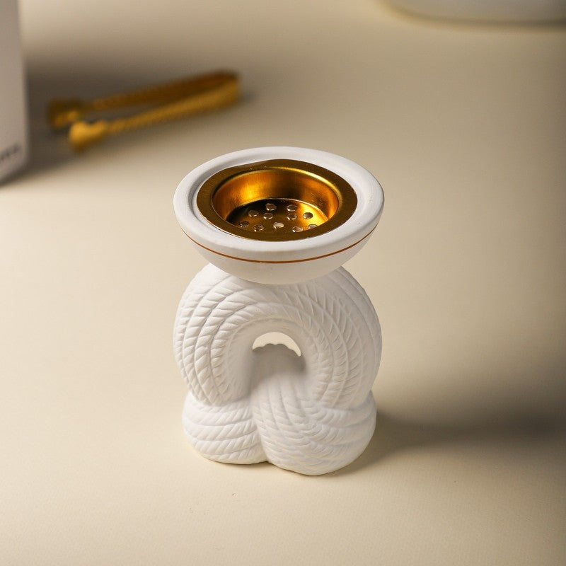 Apportez une touche d’originalité et de raffinement à vos rituels parfumés avec cet encensoir en céramique blanc au design unique. Sa base sculptée en forme de corde nouée lui donne un aspect décoratif élégant, tandis que son bol supérieur doré reflète la lumière et met en valeur la fumée parfumée de l’encens.